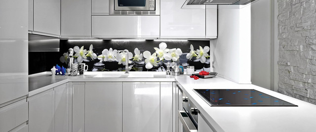 Многие дизайнеры рекомендуют параллельно с процессом выбора изображения для стеклянной панели продумать и дополнительную подсветку для рабочей зоны, помимо той, которая будет в основном комплекте освещения. Ведь при помощи удачного светового акцента можно сделать изображение еще более живым и реалистичным. Особенно удачным будет такой прием для сканалей с изображением ночного мегаполиса.