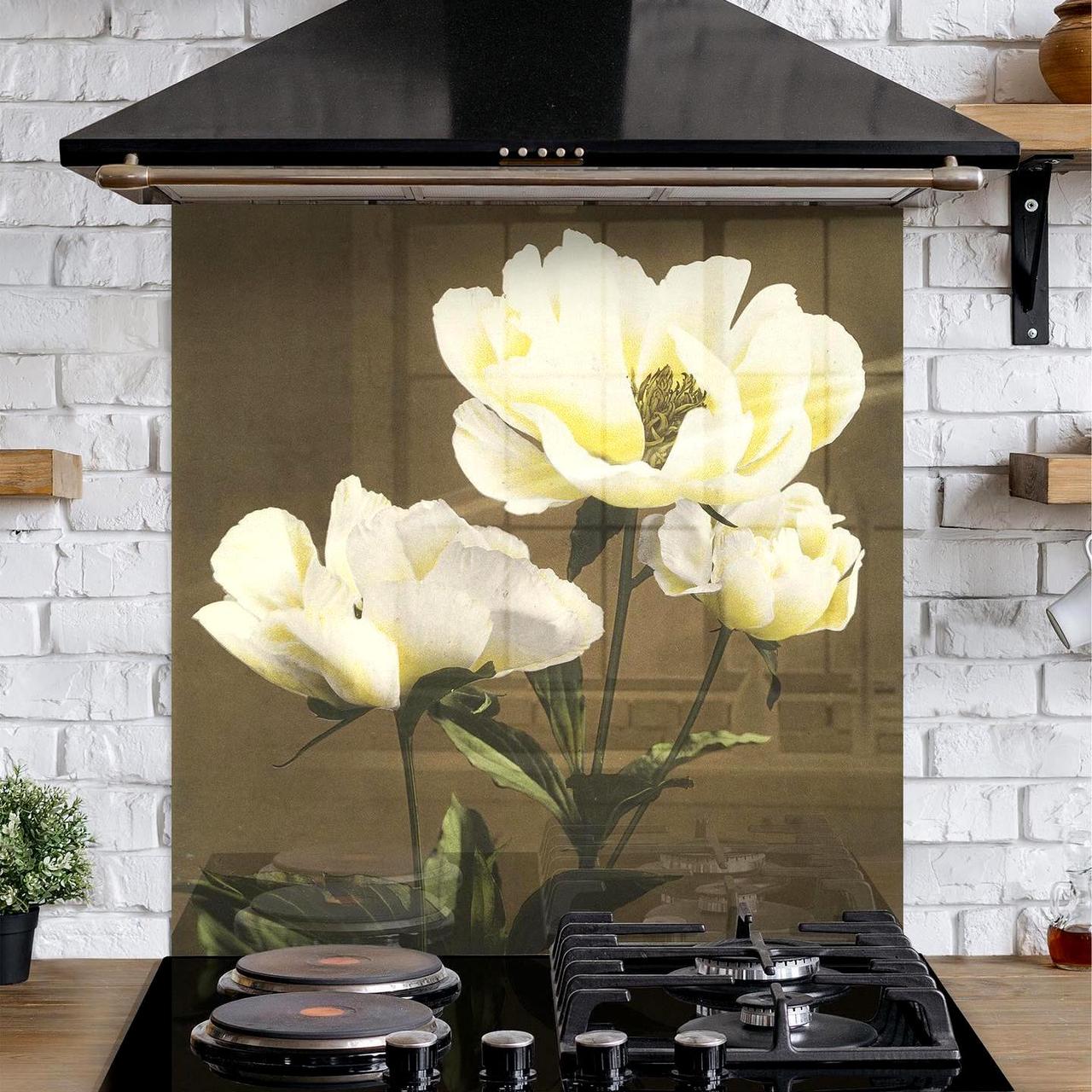 Пропонуємо встановити на робочу стіну вінтажний фартух зі скла з фотодруком трав'янистої півонії. Склопанель не тільки ефективно захищає кухонну зону над варильною поверхнею, але і є прекрасним елементом декору.